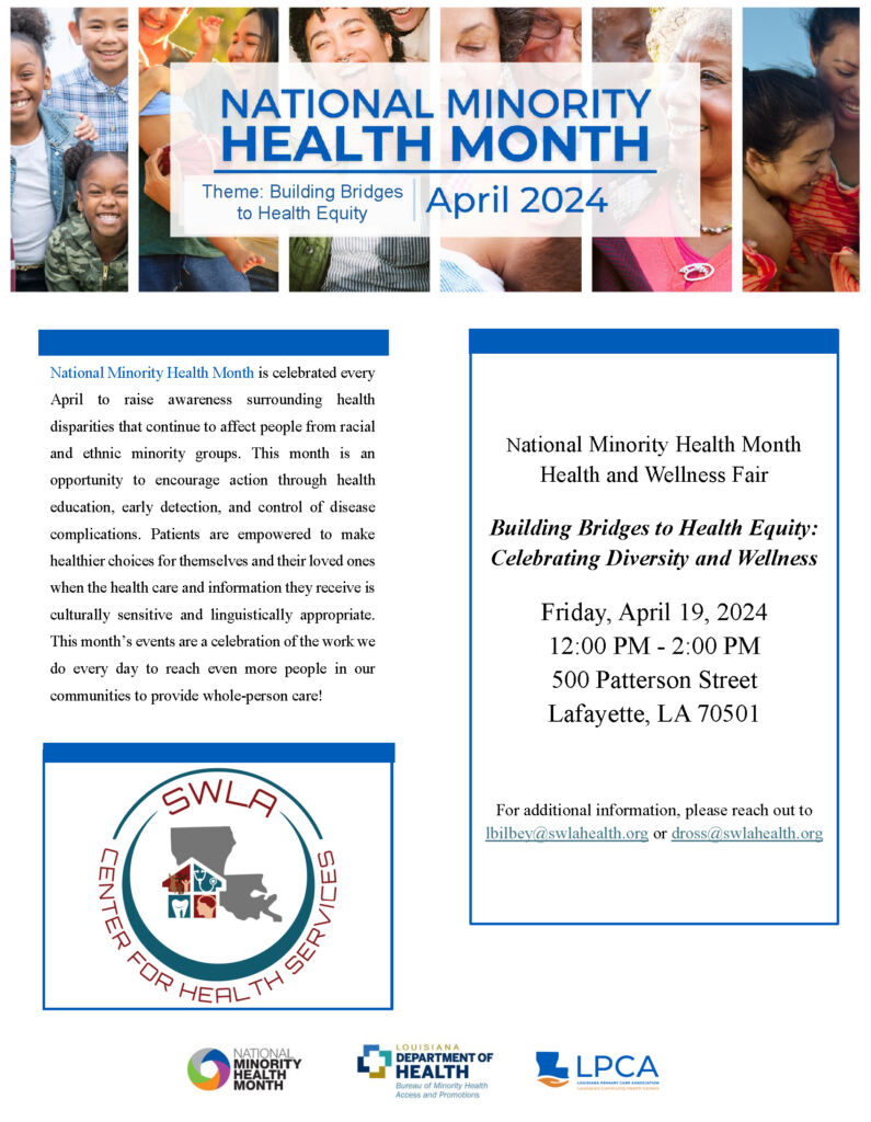 SWLA Center for Health Services Lafayette site will be hosting the 2024 National Minority Health Month Health Fair on Friday, April 19, 2024.
